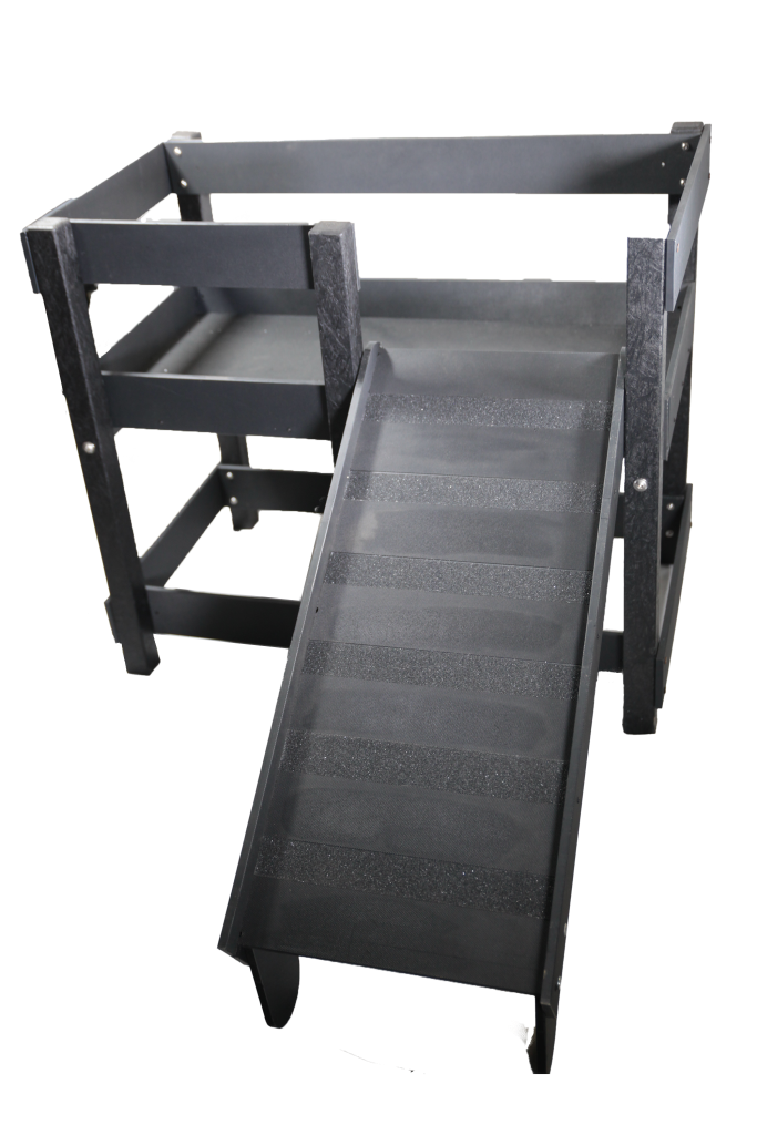 Why should you buy this? Just because you are Dog Friendly should not make you dirt friendly. When dogs are taken for walks, especialy on holiday, they inevitably get muddy. So what does the owner do when he comes back to his hotel / room/ caravan/cottage? Does he , or she, take their muddy dog into your nice clean bathroom, via your nice clean floor? With the Corby you can offer them an alternative, where they can clean their pooch outside. Being a platform the dog is at a convenient hight so that it is easy for your guests, and all that mud stays outside. It has a sturdy frame, a large tub with a drain, a ramp with grip for easy access.